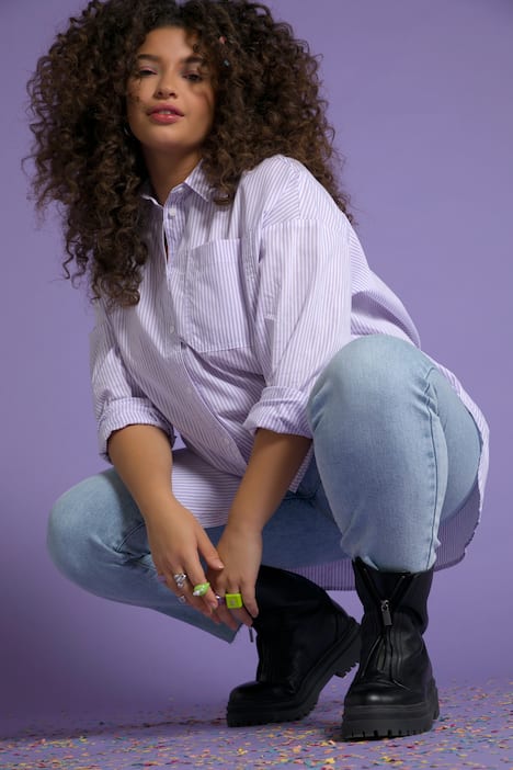 Streifenbluse, oversized, mit Hemdkragen, 2 Brusttaschen und Langarm mit Manschetten. Gerundeter Saum mit Seitenschlitzen, hinten ca. 7 cm länger.
