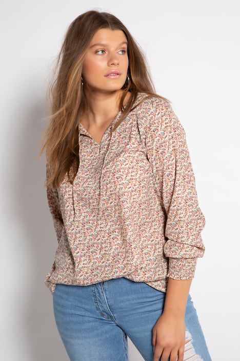 Tunika mit Flowerprint und Tunika-Ausschnitt. Langarm mit gesmokten Manschetten, gerundeter Saum, hinten länger.